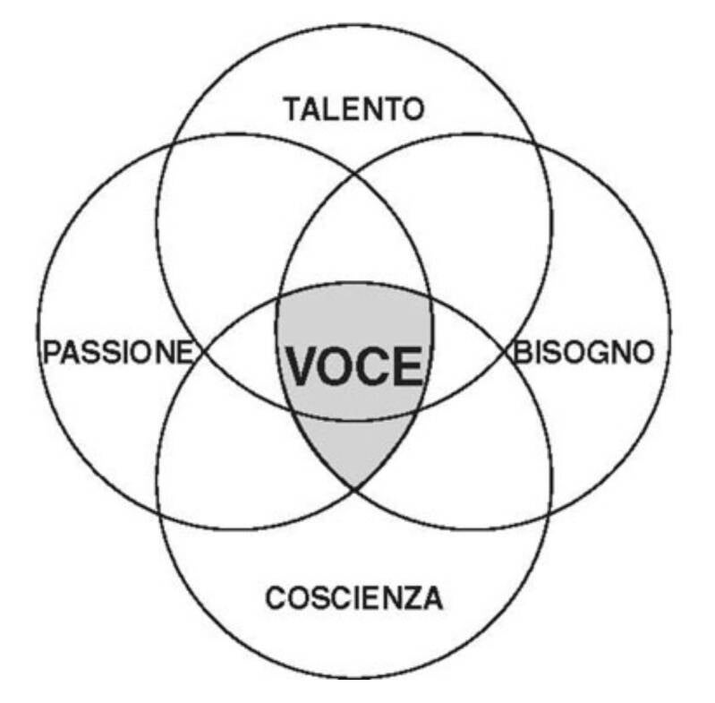 La voce è l’area d’intersezione tra talento (la forza e i doni innati), passione (ciò che naturalmente ti dà energia, stimolo, motivazione e ispirazione), bisogni (incluso ciò di cui il mondo necessita per ripagarti) e coscienza (quella calma voce interiore che ti dà la certezza di ciò che è giusto e ti incita a farlo concretamente).