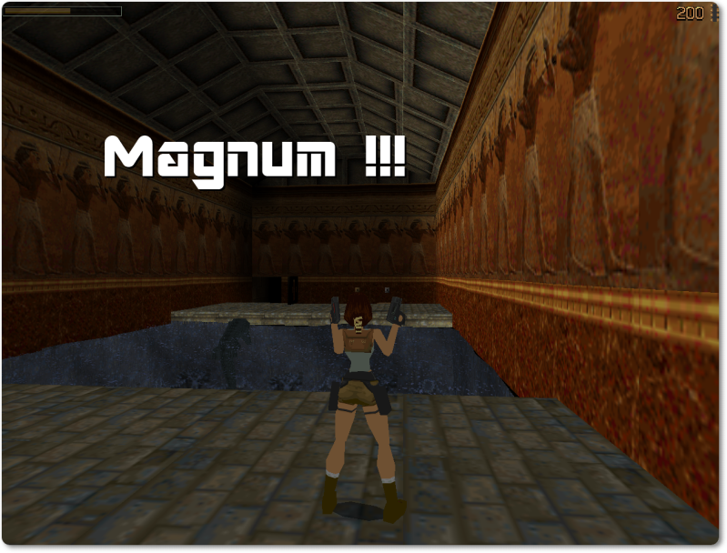 In the center of the room there’s a pool with four crocodiles that are guarding underwater doors. Take out the first two when you near the pool.